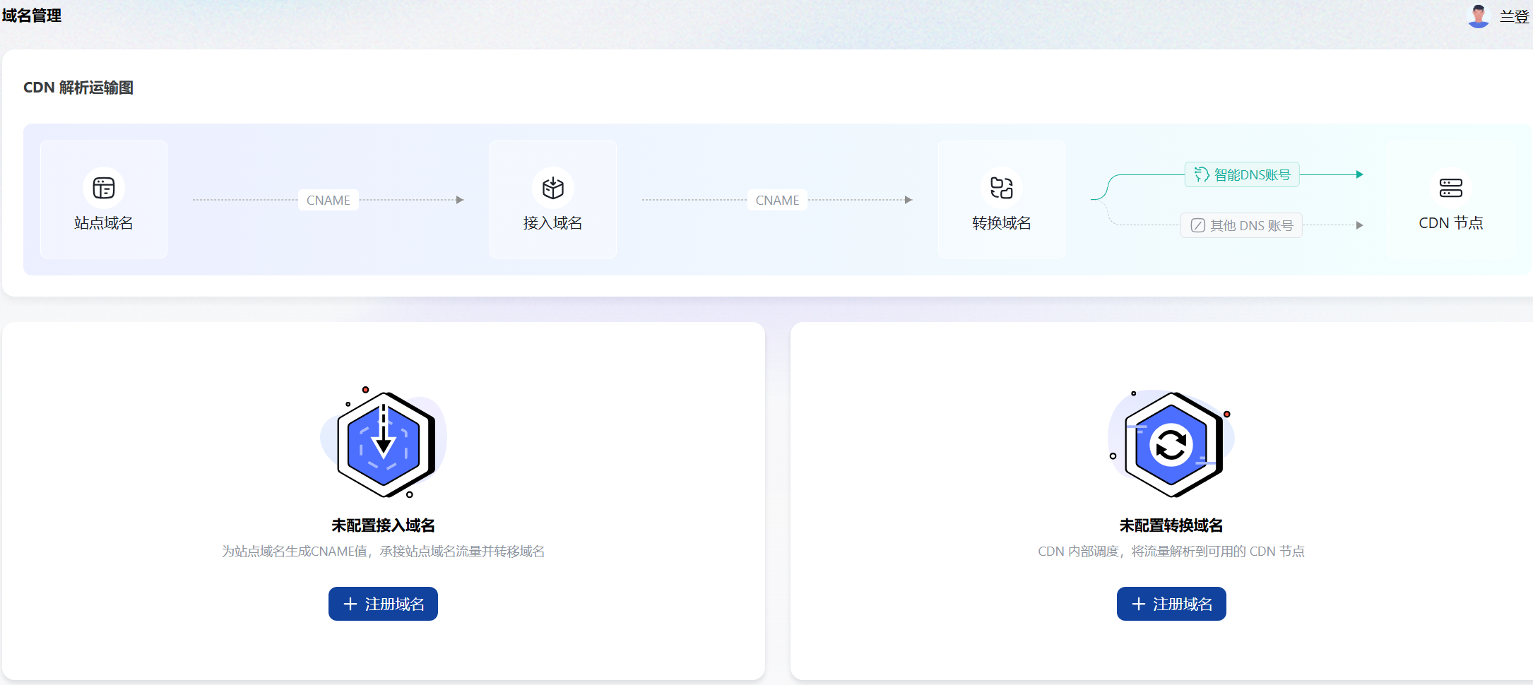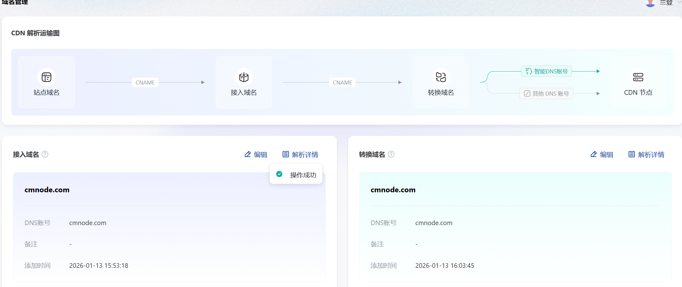 域名配置不仅是接入业务的第一步,更是构建高可用调度网络的基石。该模块深度整合了接入域名(业务层)与转换域名(调度层)的管理逻辑,其核心竞争力在于独特的“双层 CNAME”机制。