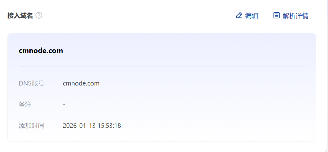 在该模块中,系统会为您的每一个站点域名生成唯一的、高可用的 CNAME 值。其核心作用在于建立一层“逻辑代理”:通过将站点域名的解析权交由接入域名承接,系统能够精准捕获所有访问流量,并利用内部协议将其无缝引导至后端的“转换域名”。这种设计屏蔽了底层节点的复杂性,确保业务流量在进入调度网络之初就具备了高度的灵活性。
